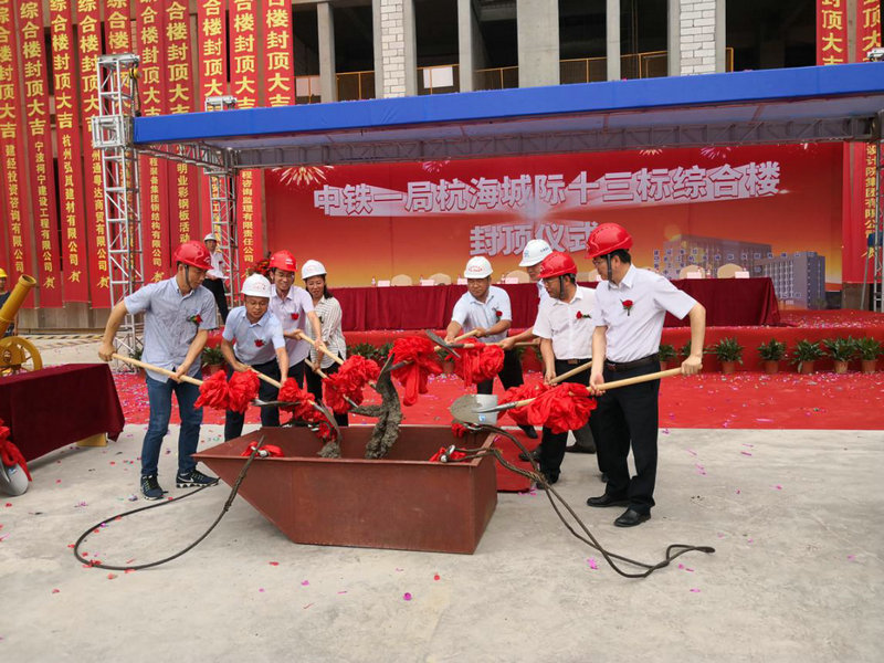 ?。ê幱崳?月10日,中鐵一局杭海城際鐵路鹽官車輛基地最大單體工程——綜合樓順利實現主體封頂。 浙江省交投集團軌道部副總經理陳明、杭海城鐵公司總經理言建標、海寧市杭海城鐵指揮部副總指揮湯治安、杭海城鐵公司副總經理鄧建林、中鐵(上海)投資有限公司杭海城際項目部項目經理張艷文、中鐵一局建安公司工會主席王淑娟以及來自監(jiān)理、設計單位的領導和嘉賓出席封頂儀式。項目部職工和勞務工代表共100余人參加。