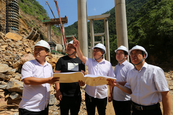 經(jīng)理卓杰(中)書記程文華(右一)、副經(jīng)理劉磊磊(右二)、總工儲(chǔ)定海(左二)、副經(jīng)理張銳軍(左一)在現(xiàn)場(chǎng)研究施工方案