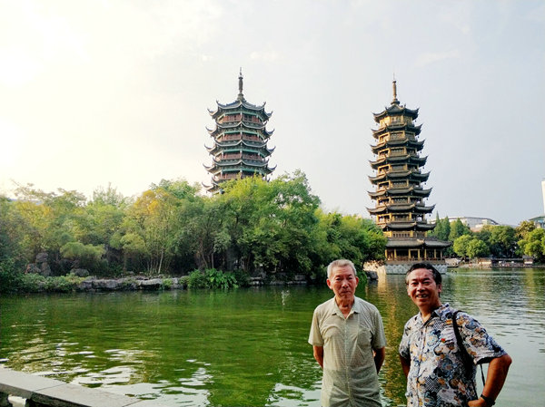 桂林石刻、七星巖拓林、世界上最大的駱駝、元風(fēng)洞、普陀山、逍遙樓,莫老兵陪著我一路游覽;駐足于烈士紀(jì)念碑和陳光烈士紀(jì)念塔之下,忽然發(fā)現(xiàn)最危險(xiǎn)的往往就是身邊最近的人,因?yàn)橹挥猩磉呑罱娜顺鲑u的信息才是最真實(shí)可靠而讓這些仁人志士被捕入獄,甚至獻(xiàn)出生命而就義;一路踏來,日月雙塔、榕湖、杉湖景色慢慢讓人流連于夜色降臨……