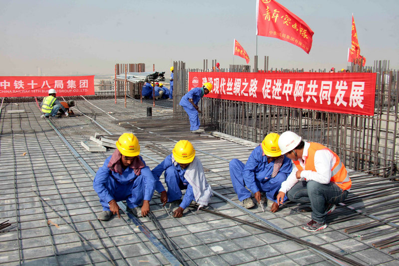 施工現(xiàn)場,是紅色的海洋,紅旗、紅燈籠、紅條幅、紅工作服……大吊車伸出長長的“手臂”,起起落落;裝載車機(jī)聲隆隆,來往穿梭,成為沙特一道亮麗風(fēng)景線,他們用實(shí)際行動落實(shí)“一帶一路”倡議。