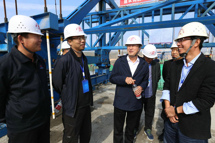 副總經(jīng)理房軍(右二)、副總經(jīng)理兼總工呂劍(左二)與神木店張公路項(xiàng)目部總工鄒森(右工)、副經(jīng)理馬大偉(左一)在橋面愉快交談