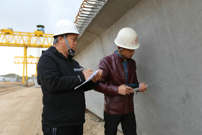 試驗人員檢測預制箱梁回彈強度???????
