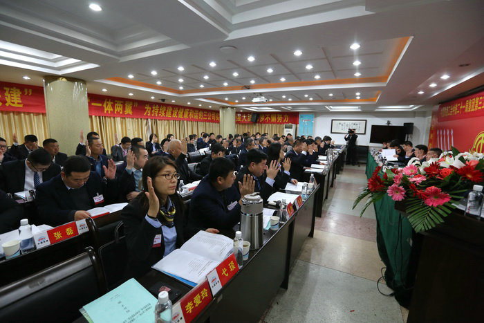 圖為舉手表決 9點零5分,由公司工會主席周普華主持召開大會預備會議。首先由公司工會辦公室主任范軼群作大會籌備工作報告;公司黨委副書記、紀委書記郝禮作大會代表資格審查情況報告;通過大會議程(草案);通過大會表決辦法;通過大會監(jiān)票人組成方案;通過大會主席團組成方案;通過大會主席團成員建議名單;通過大會常務主席、秘書長建議名單。