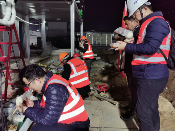 由于西安市公共衛(wèi)生中心項目建設(shè)工期緊,工序銜接緊密,中鐵一局的增援任務(wù)幾乎全部在夜間進(jìn)行。初春的關(guān)中平原乍暖還寒,在連續(xù)4個夜晚的突擊增援時間里,中鐵一局增援團(tuán)隊冒著夜間的低溫,克服了交叉施工多、作業(yè)面提供不及時、材料不能及時到位、施工機(jī)具短缺、設(shè)計方案不確定造成的返工等困難,解決了鐵皮吊頂情況下的靜壓風(fēng)管安裝難度大等技術(shù)難題,全面加強現(xiàn)場管理,全力以赴進(jìn)行生產(chǎn)突擊。在燈火通明的施工現(xiàn)場,中鐵一局增援人員有序?qū)嵤╅_孔、下料、管道連接等作業(yè),快速推進(jìn)生產(chǎn)。運料人員急促的腳步聲,開孔人員開孔時的切割聲,現(xiàn)場指揮人員指揮時的吆喝聲響成一片,協(xié)奏出一曲眾志成城忙生產(chǎn)的優(yōu)美交響樂。