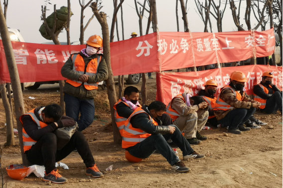 2月11日早上7點30分,在作業(yè)面上忙碌了一個通宵的中鐵一局增援團(tuán)隊出現(xiàn)在了建設(shè)工地旁的馬路上,大家或坐在地上雙手托腮小憩,或倚靠在樹干上假寐,等公司租賃的大巴到來后在車上休息了一個上午。