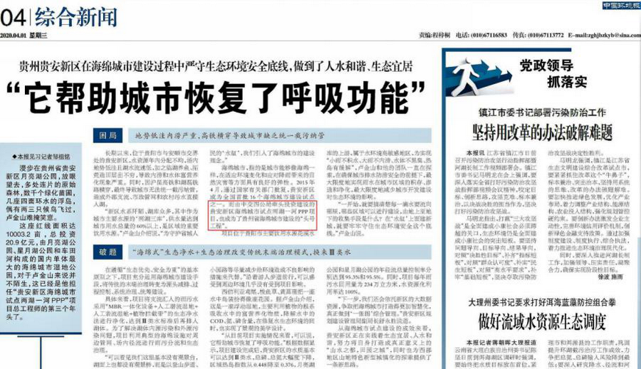 在1500多字的篇幅中,記者真實(shí)地還原了中交四公局聯(lián)合體建設(shè)者智慧治水的艱辛歷程:開工前項(xiàng)目面臨“地勢(shì)低洼內(nèi)澇嚴(yán)重及高鐵橫穿導(dǎo)致城市缺乏統(tǒng)一截污納管”的困局,通過(guò)借助低影響開發(fā)理念,技術(shù)團(tuán)隊(duì)創(chuàng)新采用“‘海綿式’生態(tài)凈水+生態(tài)治理改變傳統(tǒng)末端治理模式”進(jìn)行破局,最終成功“換來(lái)Ⅲ類水”,如愿踐行了“守護(hù)省城人民‘水缸’”的初心。盛世治水,河湖安瀾;正如記者所言:目前,“由中交四公局牽頭投資建設(shè)的貴安新區(qū)海綿城市試點(diǎn)兩湖一河PPP項(xiàng)目,也成為了貴州省海綿城市建設(shè)的‘頭號(hào)工程’”。