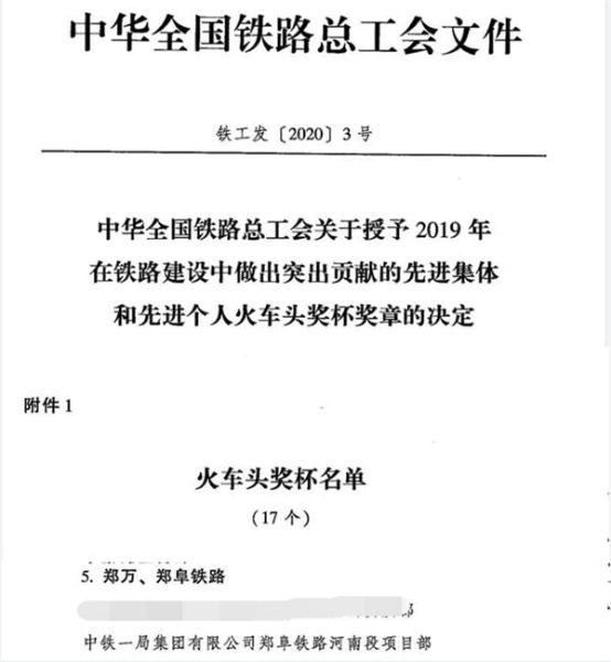 4月13日,從中華全國(guó)鐵路總工會(huì)文件獲悉:中鐵一局集團(tuán)有限公司鄭阜鐵路河南段項(xiàng)目部榮獲中華鐵路總工會(huì)“火車頭獎(jiǎng)杯”。此項(xiàng)榮譽(yù)的獲得,是對(duì)全體員工努力付出的莫大鼓舞。