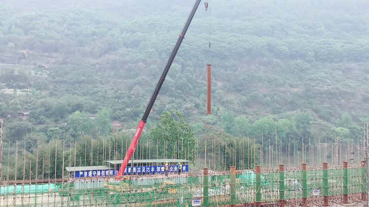 為保證項目施工過程中不影響內(nèi)六線鐵路正常運(yùn)營,水富港及火車站與渝昆高速(水麻段)聯(lián)絡(luò)線上跨、下穿內(nèi)六線立交工程在該鐵路上方設(shè)計了跨鐵路防護(hù)棚架,其中,在鐵路兩旁共設(shè)計了66根高度為11.4米至13.82m的鋼管立柱。本次鋼管立柱吊裝作業(yè)地點(diǎn)距離內(nèi)六線鐵路10KV回流線水平距離僅有2m,施工安全風(fēng)險極大。為此,四公司水富港立交項目部在施工前抓住施工要點(diǎn)和安全重點(diǎn)召開專題討論會,研究制定出最優(yōu)的安全施工方案,對現(xiàn)場作業(yè)人員進(jìn)行了系統(tǒng)的專項安全培訓(xùn),并積極與鐵路管理部門協(xié)商溝通,申請位于施工范圍內(nèi)的內(nèi)六線鐵路區(qū)段暫停運(yùn)營4小時,為防護(hù)棚架鋼管立柱吊裝作業(yè)提供充足的施工時間。在吊裝過程中,該項目部調(diào)配一輛50t吊車依次將16根直徑為0.63米,高約7米的鋼管立柱垂直吊裝超過10m高的支架平臺后,精準(zhǔn)穿過1.5m×1.5m的支架吊裝孔,與預(yù)埋的法蘭盤進(jìn)行螺栓連接。