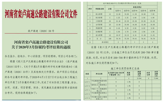 (本網(wǎng)欒川訊)2020年4月20日,河南省欒盧高速公路建設(shè)有限公司(業(yè)主單位)發(fā)布了《關(guān)于2020年3月份欒盧高速各標段履約考評結(jié)果的通報》,中鐵二十三局四公司欒盧高速LLTJ-4標段以79.61分的優(yōu)秀成績領(lǐng)先于其他各標段,奪得了3月履約考評第一名。