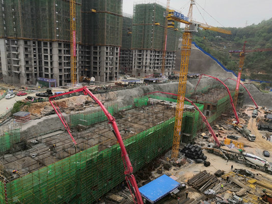 澆筑現(xiàn)場 5號、6號樓戶型相同,單層建筑面積1027平方米,其中5號樓總建筑面積37990平方米,地下四層,地上三十三層;6號樓總建筑面積36972平方米,地下三層,地上三十三層。兩棟樓均在今年春節(jié)前二十天才開始進(jìn)行基礎(chǔ)開挖。面對深基坑體量大、主樓裙樓同步施工、場地面積狹小、材料堆放困難等種種不利因素,中鐵二十三局四公司銅仁項(xiàng)目部在集團(tuán)公司及公司領(lǐng)導(dǎo)的關(guān)懷幫助下,精心策劃,認(rèn)真組織,精細(xì)管理,充分發(fā)揮了敢打敢拼的鐵軍精神,克服種種困難,高效的完成了施工任務(wù)。正負(fù)零的澆筑完成,不僅向業(yè)主及全市人民展示了參建員工鐵軍風(fēng)采,更為日后的順利封頂乃至竣工打下了堅(jiān)實(shí)的基礎(chǔ)。
