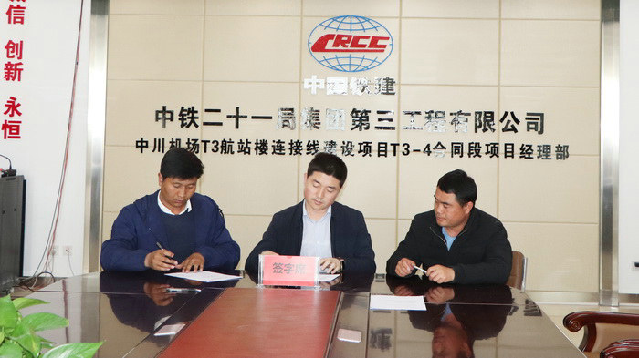 圖為項(xiàng)目經(jīng)理王亞鋒(中)簽訂施工目標(biāo)責(zé)任書(shū)