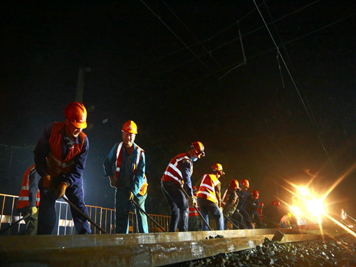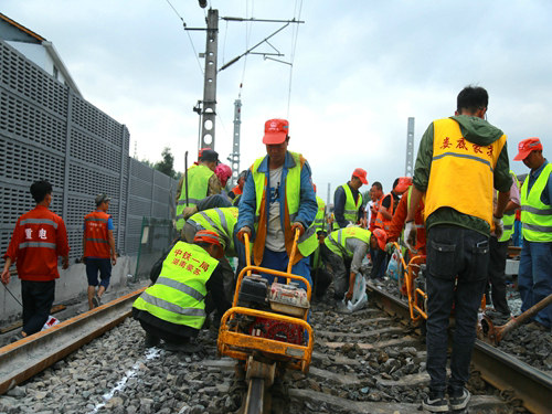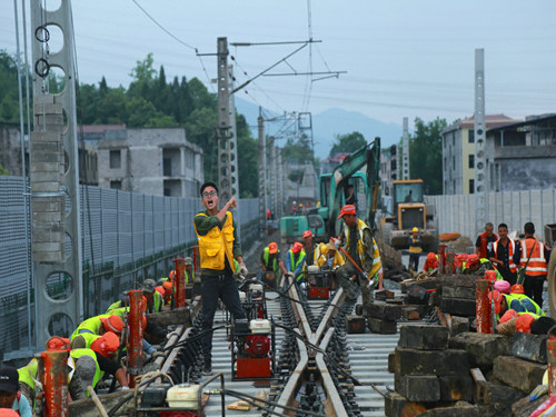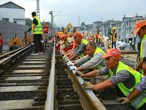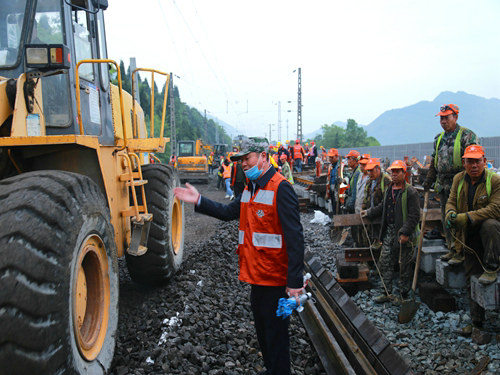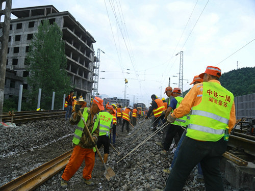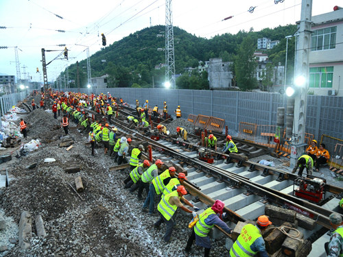 當(dāng)日17時(shí)19分,隨著封鎖命令的下達(dá),酉陽車站重、懷兩端的施工現(xiàn)場(chǎng)里人聲鼎沸、機(jī)械轟鳴,承擔(dān)施工任務(wù)的中鐵一局新運(yùn)公司涪秀二線項(xiàng)目部的800余名鐵路建設(shè)者,奮起沖鋒、爭(zhēng)分奪秒,分別在3處封鎖地段展開施工。