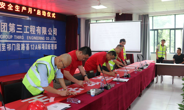 在第19個全國“安全生產(chǎn)月”活動來臨之際,項(xiàng)目部以安全生產(chǎn)月活動為抓手,圍繞“消除事故隱患,筑牢安全防線”主題,迅速成立以項(xiàng)目經(jīng)理為組長、書記、安全總監(jiān)為副組長、工區(qū)、勞務(wù)負(fù)責(zé)人為組員的“安全生產(chǎn)月”活動領(lǐng)導(dǎo)小組,為安全生產(chǎn)月活動提供組織保障,完善和制定安全實(shí)施辦法和措施,及時修訂安全應(yīng)急預(yù)案,增強(qiáng)應(yīng)急預(yù)案的針對性和可操作性。始終堅(jiān)持“安全第一、預(yù)防為主,綜合治理”的方針,圍繞安全主題,強(qiáng)化隱患排查功能,以多種形式的安全教育培訓(xùn),提高員工安全防范能力,遏制事故發(fā)生,促進(jìn)項(xiàng)目施工安全向健康方向發(fā)展。