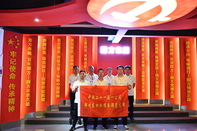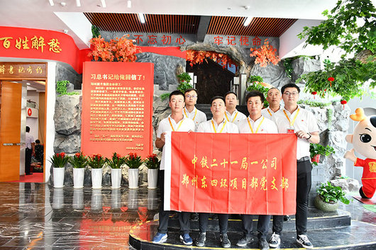 5月26日 ,中鐵二十一局一公司鄭州東四環(huán)項目黨支部在確保6.30主線橋通車會戰(zhàn)攻堅的關(guān)鍵時刻,組織支部全體黨員、入黨積極分子等15人,走進鄭州圓方集團非公黨建學(xué)院參觀交流,零距離學(xué)習(xí)體會習(xí)總書記給予勞動者們的關(guān)懷和鼓勵,鼓舞干勁、組織實施勞動競賽,全面掀起施工大干熱潮。