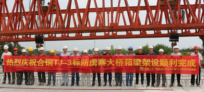 圖為建設(shè)者祝賀架梁順利完成 防虜寨大橋所屬的合銅高速公路位于陜西中部,起于陜晉交界處黃河西岸的合陽縣,向東跨黃河,與山西省規(guī)劃的聞喜至臨猗高速公路相接,途徑澄城、白水、銅川(老城區(qū)),止于演池附近,后與已建成通車的包茂高速相連共線至關(guān)莊。合銅TJ-3標線路總長12.4千米,總投資6.2745億元。合銅高速公路建成后,將極大改善銅川市東西方向的交通狀況,對促進陜西渭北果業(yè)和煤炭資源外運、帶動革命老區(qū)振興和紅色旅游開發(fā)具有重要的意義。