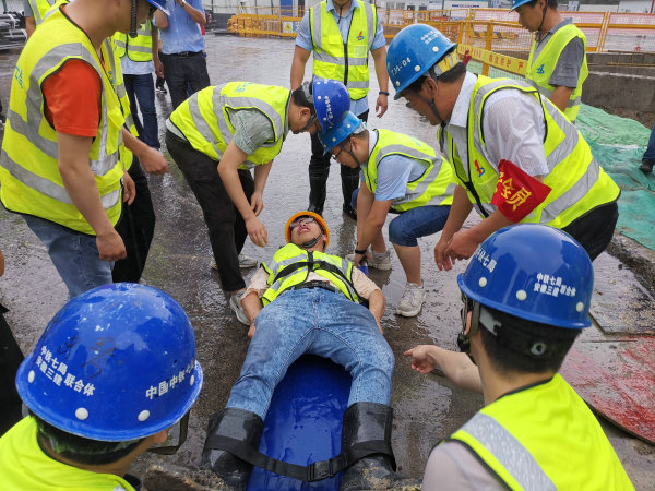 演練共分為指揮、后勤保障、報(bào)警警戒、搶險(xiǎn)救援、醫(yī)療救護(hù)等五個(gè)組。過程圍繞假定車站附屬基坑因大水沖塌,造成現(xiàn)場1名施工人員腿部沖壓,需阻斷進(jìn)入基坑水流,并進(jìn)行受傷人員解救組織展開。