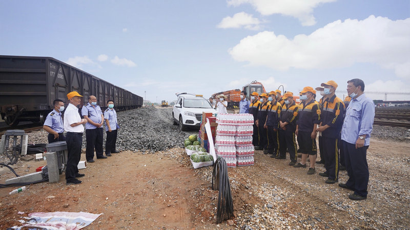 6月16日上午,中國(guó)中鐵七局武漢公司武漢北擴(kuò)能改造工程項(xiàng)目部黨支部書(shū)記陸東帶著兩車(chē)載滿礦泉水、綠茶、方便面和西瓜的車(chē)輛穿過(guò)武漢北V場(chǎng)平交道口,來(lái)到武漢北站上行運(yùn)轉(zhuǎn)車(chē)間平面作業(yè)區(qū),與車(chē)站黨委副書(shū)記常光宗、車(chē)間黨總支書(shū)記彭俊國(guó)、主任余朝等一同看望慰問(wèn)正在一線生產(chǎn)作業(yè)的調(diào)車(chē)作業(yè)人員和施工人員,為大家送清涼。