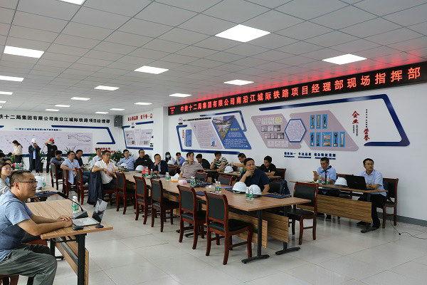 2020年6月18日江蘇省鐵路集團有限公司辦公室副部長戴成中率集團公司新入職員工來中鐵十二局南沿江城際鐵路6標學(xué)習(xí)實踐,江蘇南沿江城際鐵路有限公司副總經(jīng)理車志強陪同。參觀人員先后觀摩了跨滬寧城際鐵路特大橋跨京杭大運河連續(xù)梁施工現(xiàn)場、4#混凝土拌和站及中心試驗室。在參觀跨京杭大運河連續(xù)梁時,智能噴淋養(yǎng)護系統(tǒng)成為眾人關(guān)注的亮點,這套智能養(yǎng)護系統(tǒng),可利用手機APP遠程連接養(yǎng)護系統(tǒng)終端,實現(xiàn)定時、定量遠程操作,從供水到養(yǎng)護全過程自動化,具有靈活、方便、節(jié)水、防風(fēng)、控溫的特點。隨后參觀人員在我標段現(xiàn)場指揮部會議室認真聽取了連續(xù)梁施工工藝及技術(shù)要點講解。