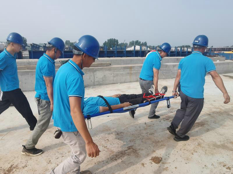 應急演練模擬了一名橋梁作業(yè)人員在施工時不慎墜落,導致左腿小腿骨折,身上多處擦傷的情景。模擬事故發(fā)生后,現(xiàn)場管理人員第一時間向應急救援小組報告情況,由項目經(jīng)理王俊生任總指揮,各應急救援工作小組接到命令后迅速抵達事故現(xiàn)場,并及時疏散圍觀群眾,防止事態(tài)進一步惡化。技術方案組負責制定應急方案;搶險救援組負責轉移物資;醫(yī)療調查組對傷員傷口進行止血、包扎,借助繃帶包扎夾板對受傷部位上下關節(jié)進行固定,并將傷員轉移至應急救援車上;安全保衛(wèi)組負責警戒、撤離無關人員和安全巡查,同時對事故現(xiàn)場進行清理,恢復正常的作業(yè)條件。