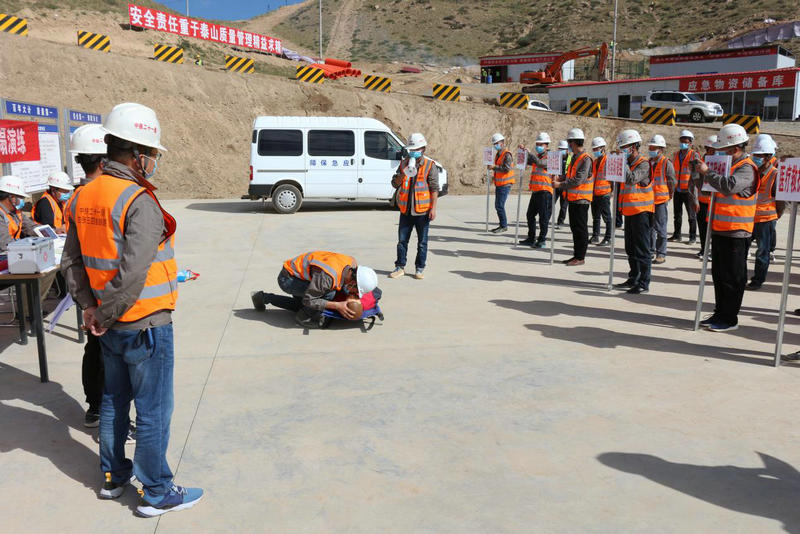 本次演練按III級響應(yīng)機制,組織隧道坍塌搶險救援,演練的主背景為新富強隧道洞內(nèi)距掌子面30米下臺階處拱頂坍塌造成4人被困,需要救援;在坍塌處理方案未經(jīng)建設(shè)、設(shè)計、施工、監(jiān)理單位確認(rèn)前,為防止坍塌繼續(xù)擴大,對鄰近初支進(jìn)行加固;被困作業(yè)人員通過施工隧道內(nèi)提前設(shè)置超高分子聚乙烯逃生管道順利逃出,有一位作業(yè)人員身體受傷,現(xiàn)場醫(yī)療搶救組人員進(jìn)行傷口包扎的過程中發(fā)現(xiàn)受傷人員心臟驟停,現(xiàn)場管理人員在聯(lián)系救護(hù)車的同時,配合醫(yī)療人員進(jìn)行心臟復(fù)蘇術(shù)及人工呼吸搶救傷員。