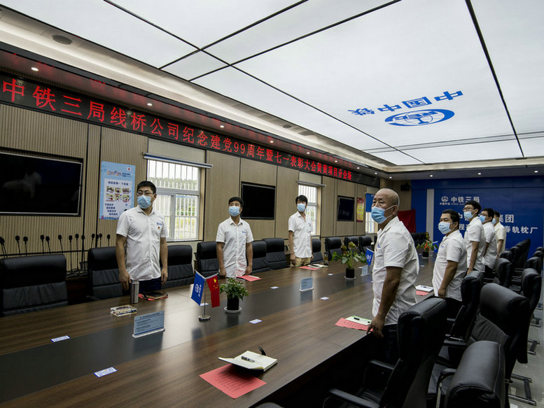 本報黃岡訊 6月29日,中鐵三局線橋公司黃黃高鐵項目視頻連線公司紀(jì)念建黨99周年暨“七一”表彰視頻會議在蘄春軌枕廠會議室接收接聽順利進行,項目部班子領(lǐng)導(dǎo)、全體黨員以及項目入黨積極分子參加了此次視頻會議。