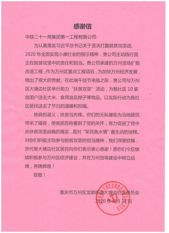 7月1日,中鐵二十一局一公司收到重慶市萬州區(qū)龍都街道大塘邊社區(qū)感謝信,感謝他們在端午節(jié)來臨之際,與萬州區(qū)大塘邊社區(qū)聯(lián)合舉行助力“扶貧攻堅”活動,為該社區(qū)10家貧困戶送去大米、食用油及粽子等物品。以實際行動為社區(qū)居民送去了節(jié)日的溫暖和祝福。