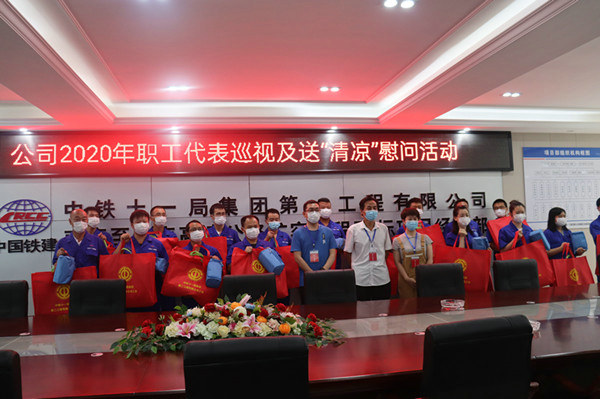 7月8日上午,中鐵十一局二公司工會副主席劉俊英等一行6人來到大廣B1項目,開展了2020年職工代表巡視及慰問活動,并給職工發(fā)放人丹、風(fēng)油精、艾草膏、涼席等大禮包,此次活動公司工會把清涼送到了施工一線,把關(guān)懷送到每一位員工的心坎里。員工在接到公司工會送來的慰問品時紛紛表示感謝,酷暑時期,雖然天氣悶熱難受,但公司工會送來的關(guān)懷,讓每位員工倍感清涼。