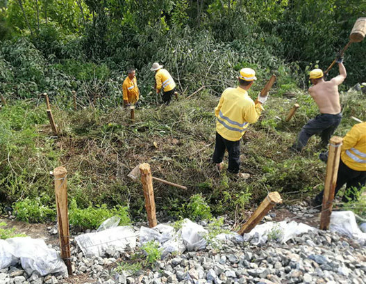 清除坍塌清淤、砍伐雜草危樹、設(shè)置牽引安全繩、路塹邊坡打樁、勘察線路周邊護(hù)坡和下游排水,各組人員通力配合、搶險(xiǎn)工作有條不紊。暴雨絲毫沒有減弱的跡象,在現(xiàn)場(chǎng),搶險(xiǎn)人員個(gè)個(gè)沖在前、干在前,不畏苦、不懼難,任憑雨水灌領(lǐng),無一人停下?lián)岆U(xiǎn)的腳步。