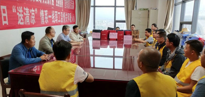 7月24日,中鐵二十一局四公司黨委書記、董事長朱昌岳,工會主席段榮福一行到蘭新客專海東西站項(xiàng)目部看望慰問一線職工,為堅(jiān)守在項(xiàng)目一線的職工送去了水杯、茶葉等防暑降溫物品。