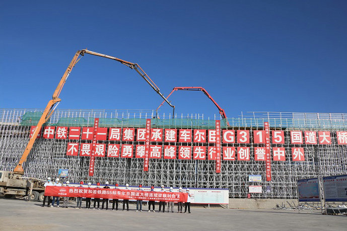 7月27日早上九點,由中鐵二十一局一公司承建的和若鐵路S5標(biāo)車爾臣G315國道大橋連續(xù)梁橋面合龍段混凝土順利澆筑完成,標(biāo)志著標(biāo)段內(nèi)主體工程已全部完工。