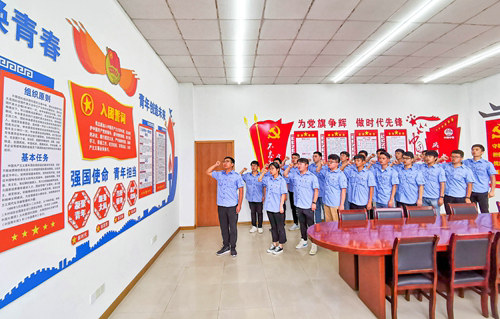 在活動尾聲,經(jīng)理部班子和各分部書記向新入職大學生贈送了入職禮物,并為新入職員工佩戴團徽,重新溫習了入團誓詞。