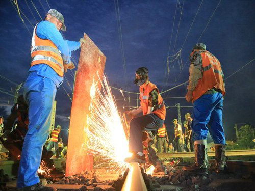 當(dāng)天17時34分,隨著開工命令的下達(dá),600余名工人在狹小的空間內(nèi)有序進(jìn)行開斷鋼軌、拆除既有道岔施工,鏟車挖機(jī)在現(xiàn)場人員的指揮下爭分奪秒地進(jìn)行破底清砟任務(wù),隨后插入軌節(jié)連通線路、K車補(bǔ)砟、大機(jī)搗固養(yǎng)護(hù)、搭設(shè)安全防護(hù)隔離網(wǎng)等站改工序均按照既定計劃穩(wěn)步推進(jìn)。