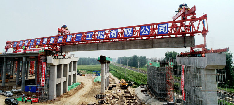 國高德上線京臺高速至國道G105段新建立交橋跨京滬、德大兩條鐵路線,中鐵十六局集團(tuán)二公司承擔(dān)的是全線難度最高、需要協(xié)調(diào)部門最多、牽涉報批手續(xù)最繁雜的涉鐵作業(yè)。本次架梁屬于臨近德大鐵路營業(yè)線施工,安全風(fēng)險大、技術(shù)含量高、施工精度要求高,為保證架梁施工順利進(jìn)展,德上高速項目部堅持“安全第一、預(yù)防為主”指導(dǎo)思想,多次召開運架專題部署會,統(tǒng)籌部署,精心組織,并對現(xiàn)場管理、作業(yè)人員嚴(yán)密做好安全技術(shù)交底,對架橋機(jī)、運梁車、吊車等設(shè)備進(jìn)行全面安全檢查,確保每道工序安全、質(zhì)量符合要求。本次箱梁架設(shè)是該項目跨德大鐵路橋20片48米特長箱梁的第一片,后續(xù)施工中,跨德大鐵路還將架設(shè)24米箱梁34片,跨京滬鐵路橋?qū)⒉捎孟绕叫杏阼F路進(jìn)行掛籃現(xiàn)澆T型剛構(gòu)主體、后轉(zhuǎn)體就位的工藝施工,預(yù)計將在今年9月底之前完成全部架設(shè)施工。