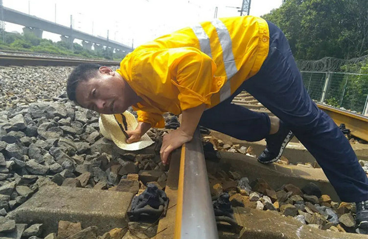 驕陽(yáng)似火。鐵路軌道在烈日的暴曬下,鋼軌溫度達(dá)到了56.7度,遠(yuǎn)遠(yuǎn)望去,鐵路上熱浪滾滾。任廣思俯身跪在鋼軌頂面,臉孔緊貼鋼軌邊緣,檢查鋼軌的平直度。繼而,他站起身騎跨在鋼軌上,使勁擠了擠眼簾上的汗水,仔細(xì)查看鋼軌方向有無(wú)變化。“當(dāng)氣溫達(dá)到或超過35度時(shí)我們就要進(jìn)行巡查,檢查鋼軌的高低、方向狀態(tài)。”任廣思大喝幾口水指著鋼軌說:“正常狀態(tài)下,鋼軌是這樣筆直的,如果出現(xiàn)連續(xù)小彎,那就是有脹軌跡象,我們必須立即采取緊急措施,防止小彎進(jìn)一步擴(kuò)大。”