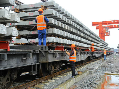 建設(shè)者引導(dǎo)T梁運(yùn)往施工一線