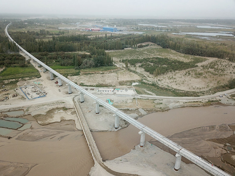 圖為車兒臣河特大橋新建和田至若羌鐵路S5標(biāo)位于新疆巴音郭楞蒙古自治州境內(nèi),經(jīng)過且末縣及新疆生產(chǎn)建設(shè)兵團(tuán)。線路沿昆侖山北麓的山前洪積平原和塔克拉瑪干沙漠南緣與G315國(guó)道并行自東向西延伸,是南疆通往內(nèi)地又一便捷通道的重要組成部分。
