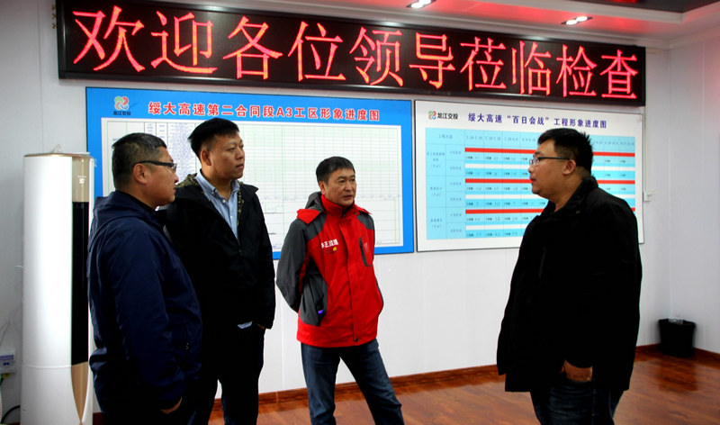 黑龍江省綏慶高速公路投資建設(shè)有限公司副總經(jīng)理趙永輝、總工程師尤丹峰,中鐵二十三局二公司綏大項目經(jīng)理李百成、項目書記王寶和及班子成員參加檢查活動。