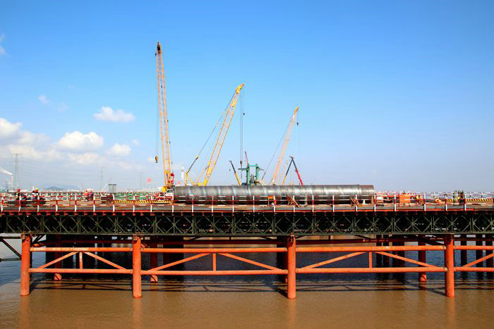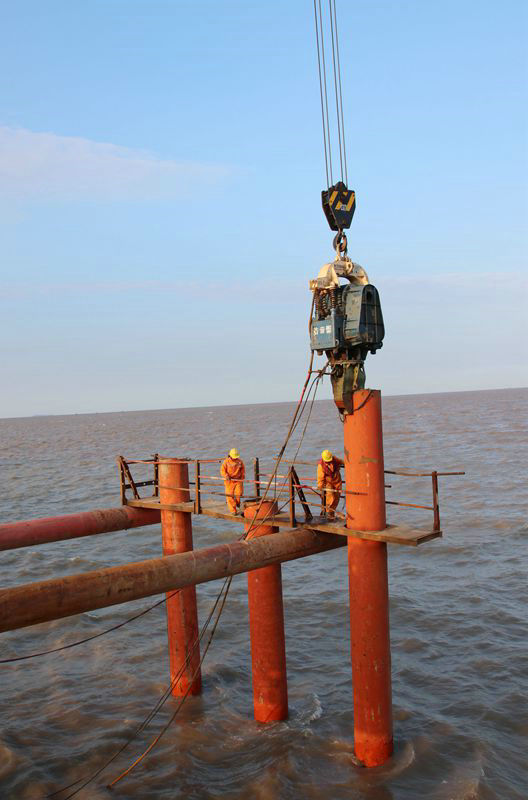 位于寧波境內(nèi)淺海區(qū)域的濱海高架橋和濱海互通立交主線(xiàn)全長(zhǎng)6.9公里,8座匝道橋長(zhǎng)6386.626米,橫跨既有線(xiàn)金塘大橋,施工地段為3---5.2米深的海域淺水區(qū),設(shè)計(jì)為6車(chē)道,主線(xiàn)橋34.5米寬,時(shí)速120公里,總投資22.3億元。海底下鋪排著多條自來(lái)水、天然氣、石油管道,地質(zhì)結(jié)構(gòu)復(fù)雜,樁基施工難度大。樁基、承臺(tái)、橋墩施工均在海水里,必須搭設(shè)一條15公里長(zhǎng)的鋼棧橋,以滿(mǎn)足幾百臺(tái)機(jī)械設(shè)備上橋作業(yè)、運(yùn)輸、堆放數(shù)量龐大的工程物資。為了打好這一戰(zhàn),該項(xiàng)目通過(guò)公開(kāi)招標(biāo)形式,選定海上施工經(jīng)驗(yàn)豐富的3家鋼棧橋施工隊(duì),并陸續(xù)于去年9月1日正式開(kāi)始拉開(kāi)海上架設(shè)6.5米高、8米寬鋼架橋序幕。三家棧橋施工隊(duì)在項(xiàng)目部協(xié)調(diào)組織下很給力,各負(fù)責(zé)一段,通力合作,主線(xiàn)橋棧橋于互通立交棧橋作業(yè)同時(shí)進(jìn)行。采用70噸的履帶吊懸掛振動(dòng)錘,由振動(dòng)錘咬住直徑0.66米的鋼管,向下震壓的辦法,將鋼管穿透海底淤泥層,直至36米深的膠泥或沙土層為止。然后將整齊排列的“梅花樁”用鋼管、角鋼、工字鋼分層焊接起來(lái),再在上面拼裝一層抗壓力很強(qiáng)的厚鋼板。為了保證施工人員作業(yè)安全,在棧橋兩側(cè)安裝1.2米高的鋼管防護(hù)欄。每道工序如流水作業(yè)般環(huán)環(huán)相扣、銜接緊密、有條不紊。插入海底泥土中的鋼管,需3段鋼管對(duì)接,一氣呵成,不偏不倚地直達(dá)膠泥層或沙土層。