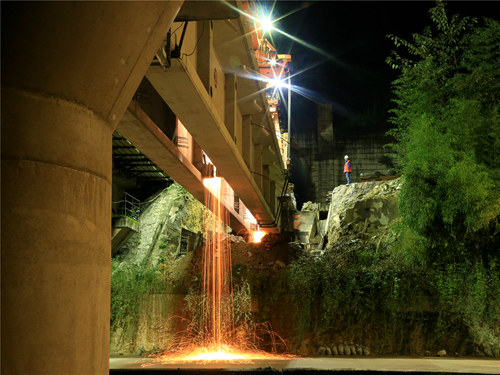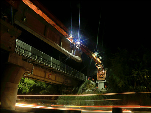 當(dāng)晚23時(shí)50分許,隨著最后一片32米預(yù)制T梁的架設(shè)完畢,標(biāo)志著該特大橋歷經(jīng)14天的緊張施工后順利實(shí)現(xiàn)貫通,為后續(xù)橋面系及鋪軌作業(yè)的快速推進(jìn)打下了堅(jiān)實(shí)基礎(chǔ)。