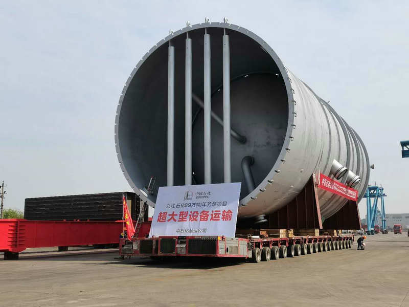 九江石化89萬噸/年芳烴項目大件設備運輸共分為四個批次,總重約4385噸,全部由中鐵九橋重件碼頭吊裝、運輸。項目涉及超大件運輸共有14件,其中單件重量最大運輸段為抽余液塔吊段,重440噸。單件最長運輸段為二甲苯塔吊段長度為33米。