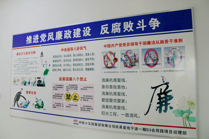 這個項目規(guī)模大、誘惑多,對每個管理人員都是一次廉潔自律考驗。去年9月份開工以來,項目部班子成員、各部門負責人層層簽訂廉潔從業(yè)承諾書,并張貼在黨務公開欄進行公示,接收廣大職工監(jiān)督。黨支部要求每個重要崗位人員要言行一致,表里如一,堅守法律底線,不碰紅線。同時,黨政主管分別找班子副職、各部門負責人進行廉潔談話,要求正確用好手中權力,不得以權謀私,與分包隊、材料供應商保持距離,想要人不知除非己莫為,沒有不透風的墻,要算好人生經(jīng)濟賬、政治賬、家庭賬,不要因小失大,毀掉前程,害了家庭。在這基礎上,項目黨支部書記、副書記分別找分包單位負責人、材料供應商談話,奉勸他們遵紀守法,不允許向項目部重要崗位人員行賄,一旦發(fā)現(xiàn)線索,交由上級紀檢部門一查到底,誰行賄,與誰終止合同。