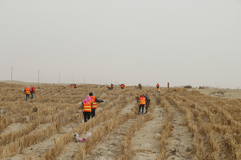 圖為項(xiàng)目部施工人員進(jìn)行蘆葦草方格施工