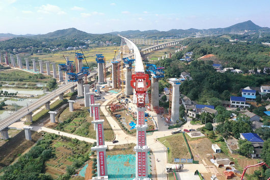 本站湖南長沙訊:10月28日上午10:50,隨著一榀24米箱梁穩(wěn)穩(wěn)的落在黃橋大道98#墩-99#橋臺上,標志著常益長鐵路黃橋大道特大橋全橋箱梁架設(shè)施工完美收官。