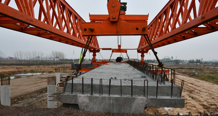 據(jù)悉,項目預(yù)制梁場承擔(dān)制梁任務(wù)434片,主要包括箱梁、T梁等;最長的梁長度為35米。此次架設(shè)的是釜山樞紐互通主線橋右幅邊跨邊梁,設(shè)計梁長25m,梁高1.4m,梁頂板寬2.85m,梁底板寬1m,采用架橋機(jī)進(jìn)行吊裝架設(shè)。