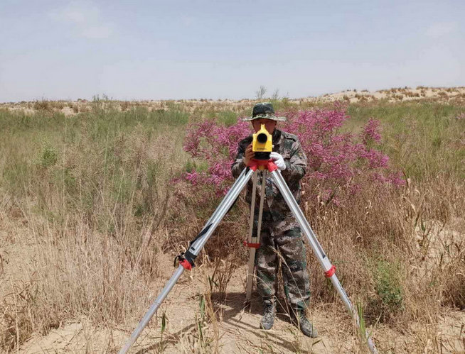 進(jìn)入大漠,他們手頭僅有的導(dǎo)航工具便是手機(jī)上的奧維地圖,信號(hào)時(shí)斷時(shí)續(xù),數(shù)據(jù)更新滯后不時(shí)發(fā)生,為防止迷路,他們便在重要地段插上鮮紅的旗幟作方向標(biāo)。有一次隊(duì)員們?cè)诖竽杏錾狭送蝗缙鋪淼纳硥m暴,他們立刻收了儀器,向附近車輛奔去,黑壓壓的沙塵瞬間吞沒了汽車,他們坐在車?yán)锊唤魂嚭笈?,片刻后他們又商討起來下一步測量計(jì)劃。沙暴把測量時(shí)留下的腳印覆蓋了,把作為方向標(biāo)的旗幟吹倒了,把部分樁點(diǎn)吹歪了,他們不得不一次次重新測量。