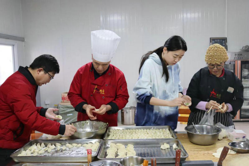 項(xiàng)目部餐廳熱鬧非凡,和面的和面、剝蔥的剝蔥、拌餡的拌餡、燒水的燒水,搟皮兒的搟皮兒,大家為迎接幸福祥和的冬至而忙碌著,各自分工,場(chǎng)面齊樂融融。餃子在每名職工的手里,玲瓏剔透,仿佛施了魔法一樣,個(gè)個(gè)飽滿可愛、形態(tài)各異。