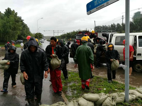 由于中鐵十四局集團(tuán)承建的長春地鐵2號(hào)線西延線汽車公園站,地勢處在該區(qū)域最低位置,周圍地面雨水沿自主大路、凱達(dá)北街和紅旗廣場直接匯聚至凱達(dá)北街與東風(fēng)大街交匯處向北150m的輔路上(汽車公園站),路面積水深度達(dá)90cm左右,已超過施工場地永久圍擋基礎(chǔ),眼看一場難以抗拒的自然災(zāi)害即將來臨。這時(shí),現(xiàn)場巡視員迅速將這一險(xiǎn)情報(bào)告項(xiàng)目部,項(xiàng)目部接到險(xiǎn)情報(bào)告后,立即啟動(dòng)防汛應(yīng)急預(yù)案,并迅速組織36人趕赴現(xiàn)場搶險(xiǎn),其中7人負(fù)責(zé)對東側(cè)排水系統(tǒng)進(jìn)行疏通,9人負(fù)責(zé)安設(shè)水泵對基坑進(jìn)行抽排水,其余20人負(fù)責(zé)裝沙袋,隨時(shí)準(zhǔn)備攔截洶涌而來的雨水……