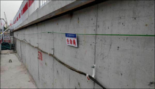 為減少高空作業(yè)安全風(fēng)險(xiǎn)。讓工人更加安全放心地高空作業(yè),安質(zhì)部又提出在基坑“軌道式移動(dòng)防塵網(wǎng)”安裝的基礎(chǔ)上,增設(shè)一組滑輪,通過(guò)花籃螺栓沿著鋼支撐架設(shè)方向,對(duì)拉鋼絲繩,起到高空作業(yè)防墜落的作用,有效解決了安全帶“無(wú)可牽掛”的窘境。防墜落鋼絲繩按照“高掛低用”原則設(shè)置,在行走時(shí)人可以手扶著鋼絲繩平穩(wěn)通過(guò),這為高空作業(yè)施工又上了“一道保險(xiǎn)”。因此,大家戲稱(chēng)它為“生命繩”。“現(xiàn)在高空作業(yè)比以前安全多了”,老王告訴了自己體驗(yàn)后的感覺(jué)。