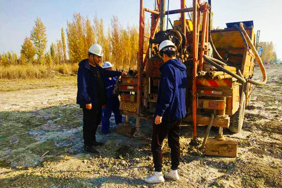 圖為檢測人員正在進(jìn)行水泥土攪拌樁鉆芯取樣試驗