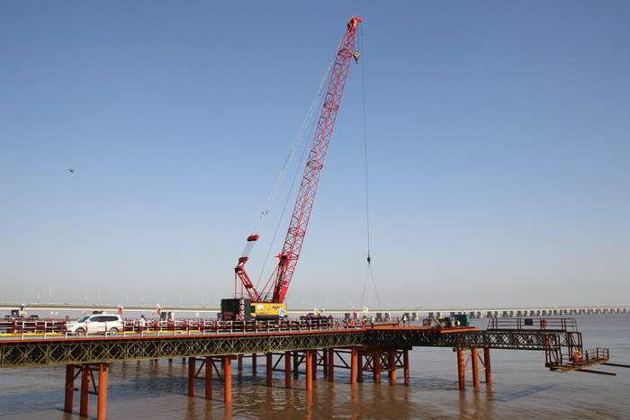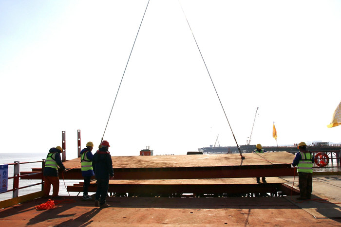 該公司采取棧橋先行,橋梁下部結(jié)構(gòu)緊隨的戰(zhàn)略推進施工。為加快施工,該公司投入多支施工隊伍,100多臺履帶吊、汽車起重吊、鉆孔機等大型設(shè)備作強有力支撐。2020年8月份開工以來,將濱海高架和濱?;ネㄗ鳛槭┕るy題中的重中之重去攻克,并根據(jù)進度需求,增加隊伍和樁基隊伍,科學(xué)組織,晝夜作業(yè),截止今年1月1日,打入海下樁基796根,搭設(shè)鋼棧橋9269米、作業(yè)平臺116個基本滿足了插打鋼護筒、鉆孔機鉆孔泥漿反循環(huán),承臺、墩身施工和工程材料運輸需要。